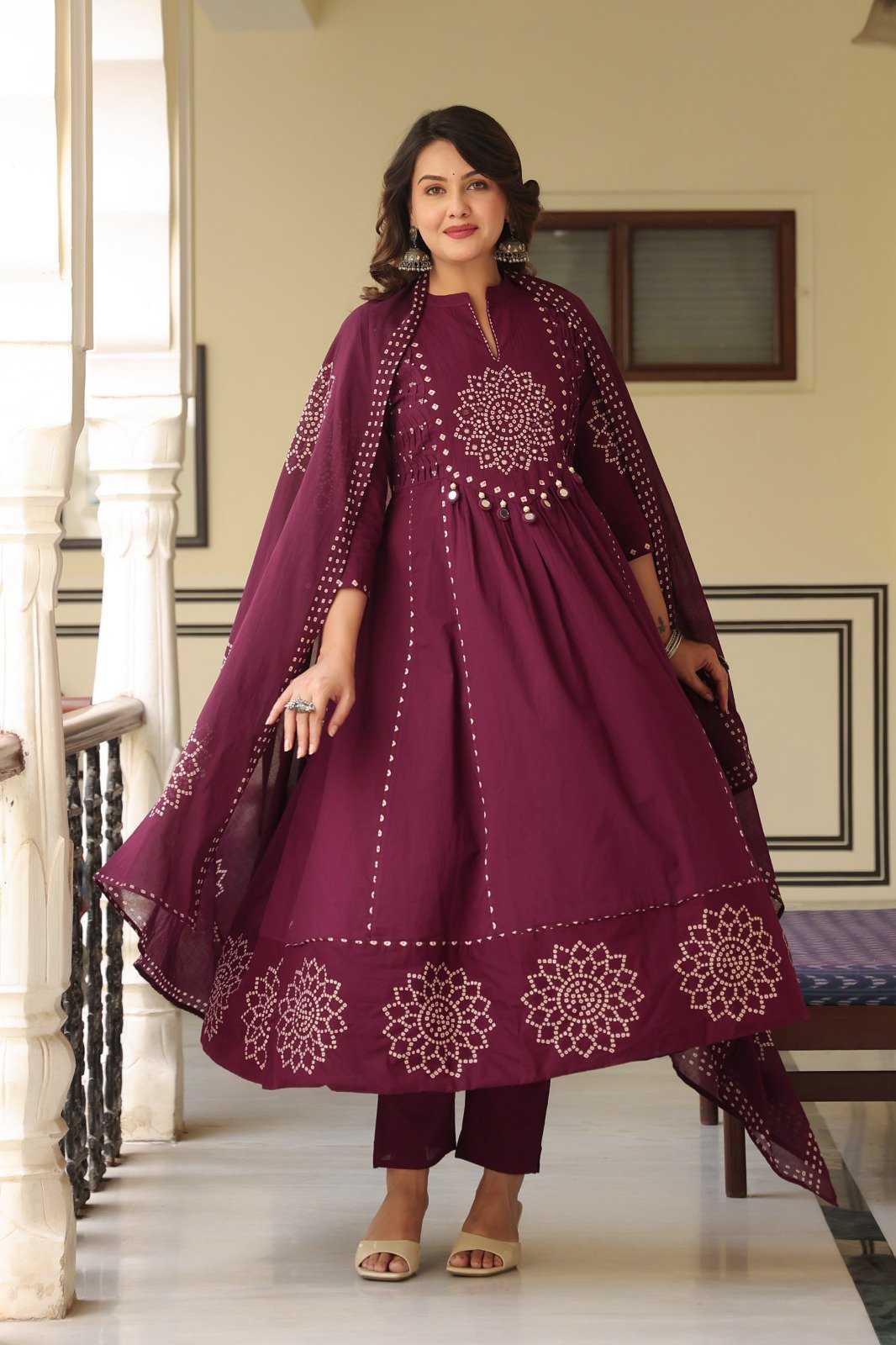 Step into timeless elegance with this beautifully designed pure cotton Anarkali suit set. Crafted from soft and breathable cotton, it offers a perfect blend of comfort and traditional charm.